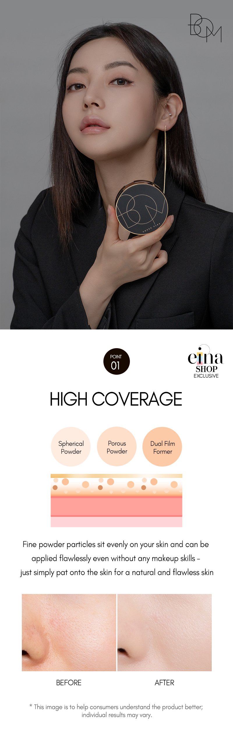 1. High coverage: Fine powder particles sit evenly on your skin and can be applied flawlessly even without any makeup skills – just simply pat onto the skin for a natural and flawless skin.
