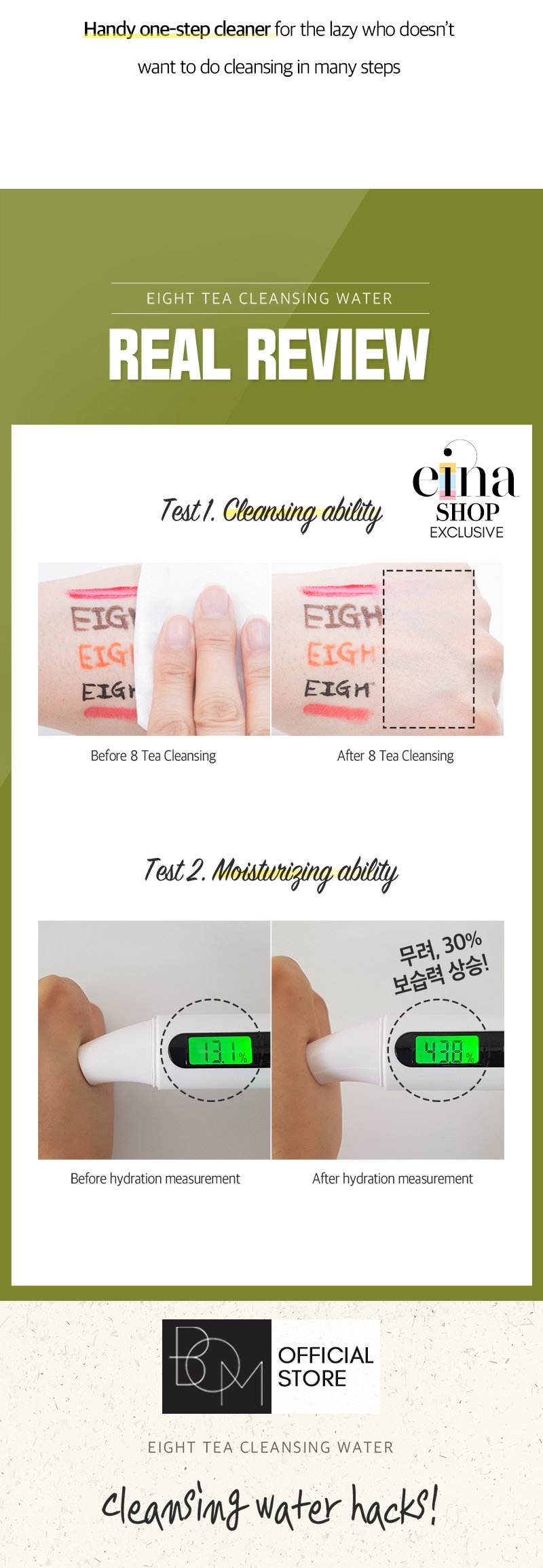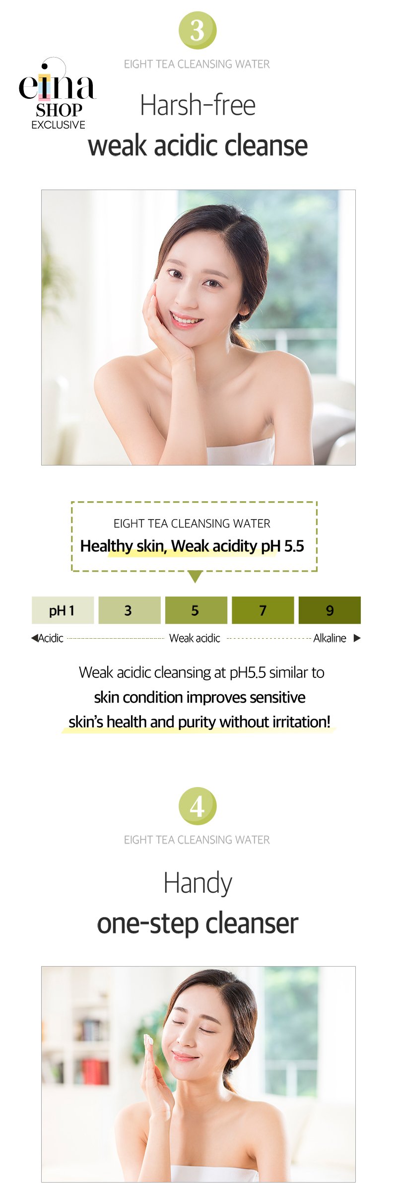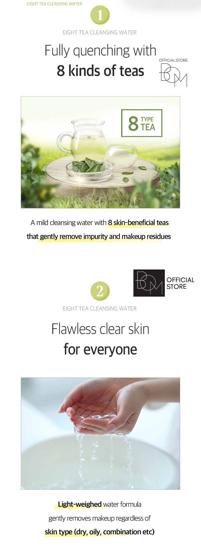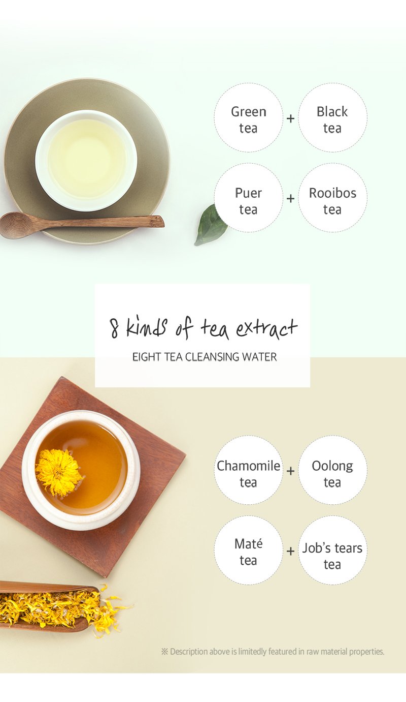 Fully quenching with 8 kinds of teas – A mild cleansing water with 8 skin-beneficial teas that gently remove impurity and makeup residues