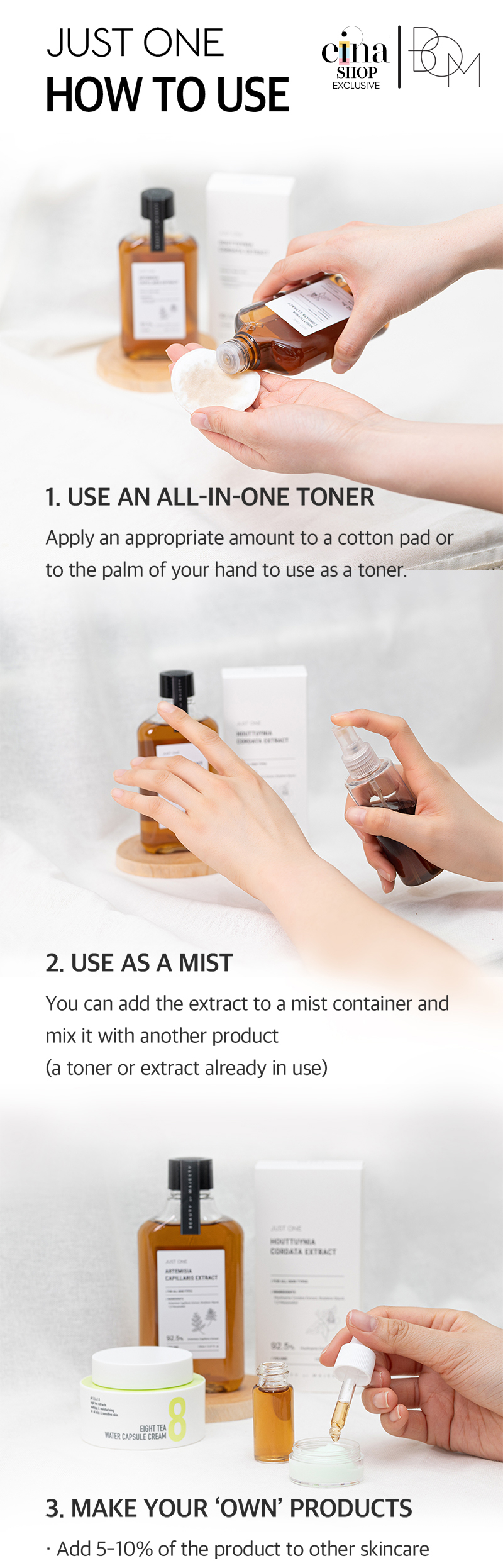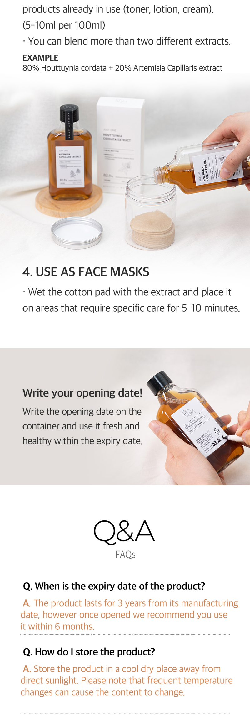 You can use the extract as a toner, as a mist by mixing it with another toner that you are using or you can use it as a face mask by applying it to a cotton pad and placing it on needed areas. You can mix 2 or more extracts together or add them to toner, lotion, or cream you use with a 5-10% ratio in accordance with the texture.