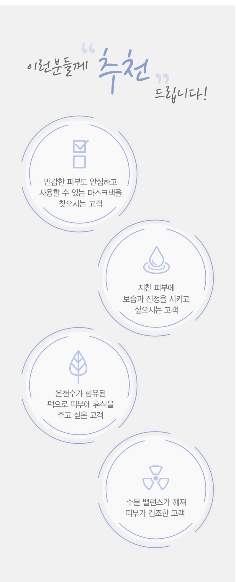 • Gel texture filled with hot spring essence. The sheet wraps up the face and the active ingredient of the essence deliver effectively.