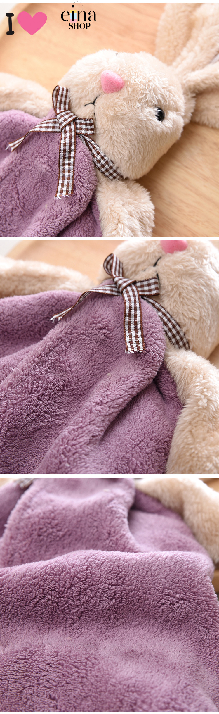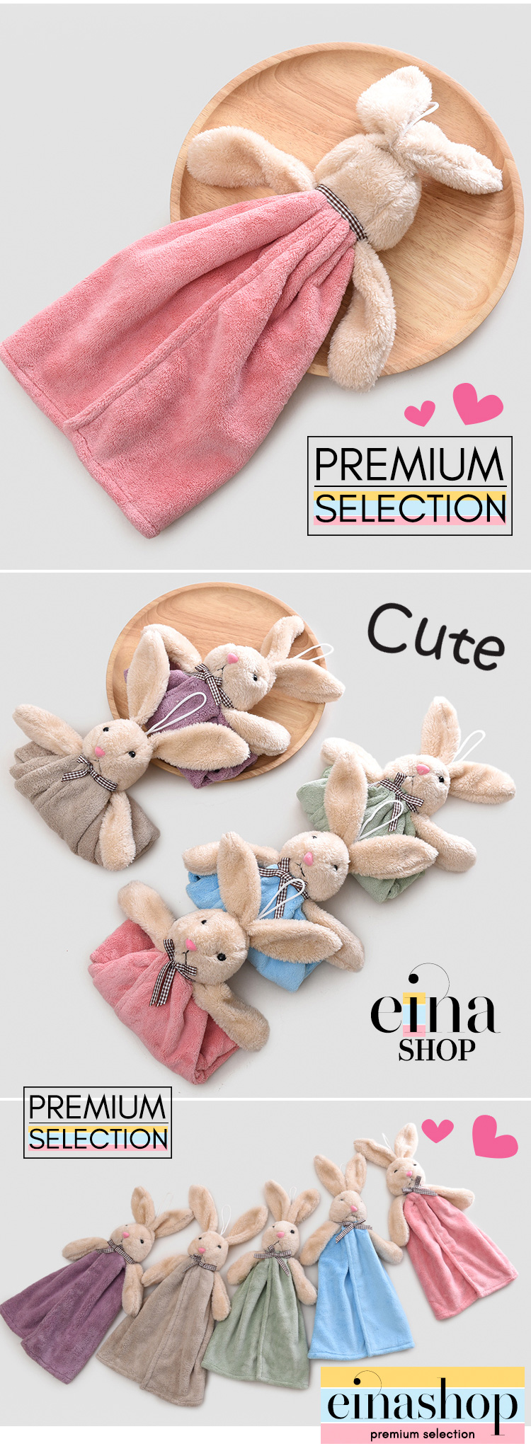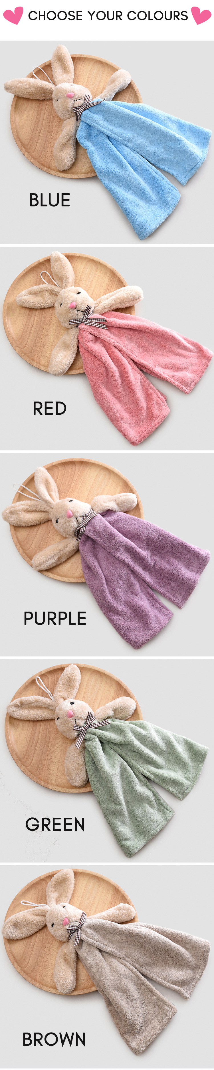 Made of premium coral fleece. The towel comes with an attached hanger. Soft touch and highly absorbent. Comes in a cute bunny design.