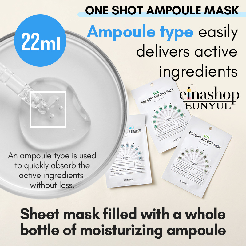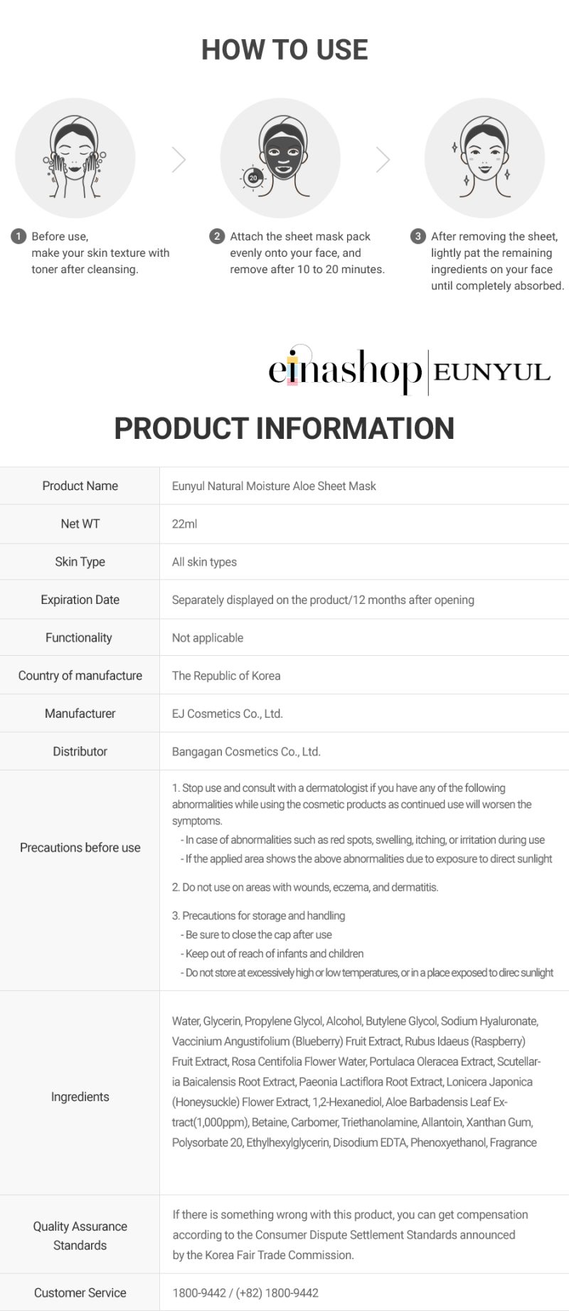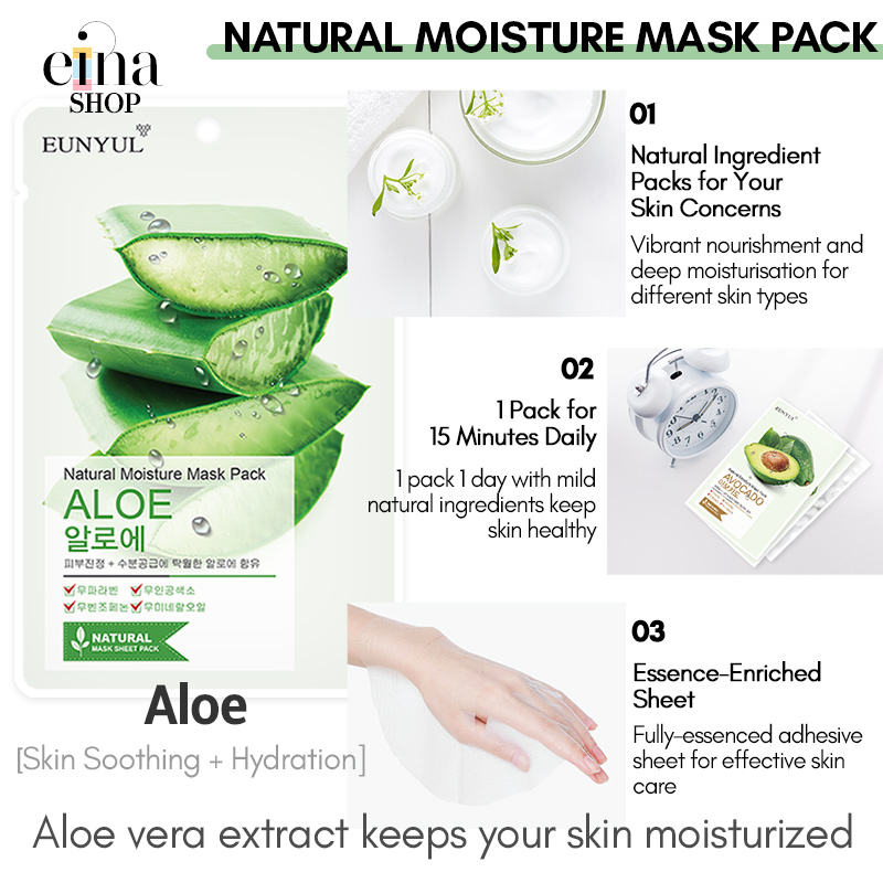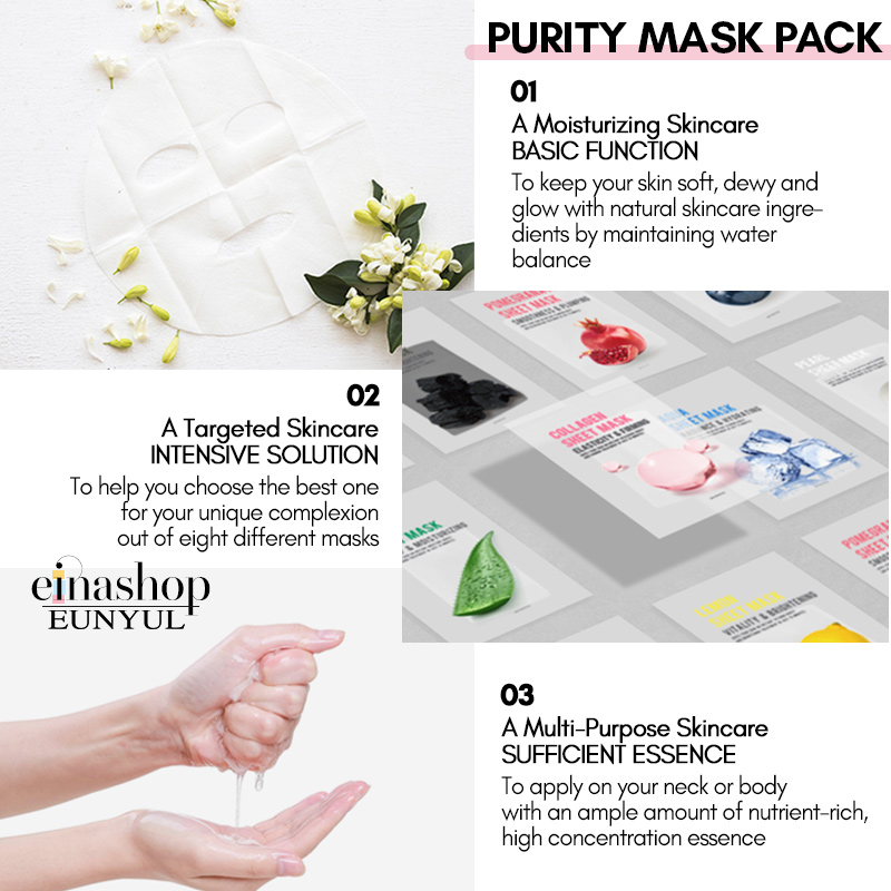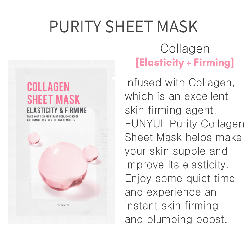 Eunyul Face Mask is available in 4 types. Natural Aloe Vera Sheet Mask, One Shot Collagen Sheet Mask, One Shot Hyaluronic acid Sheet Mask, and Purity Collagen Sheet Mask.