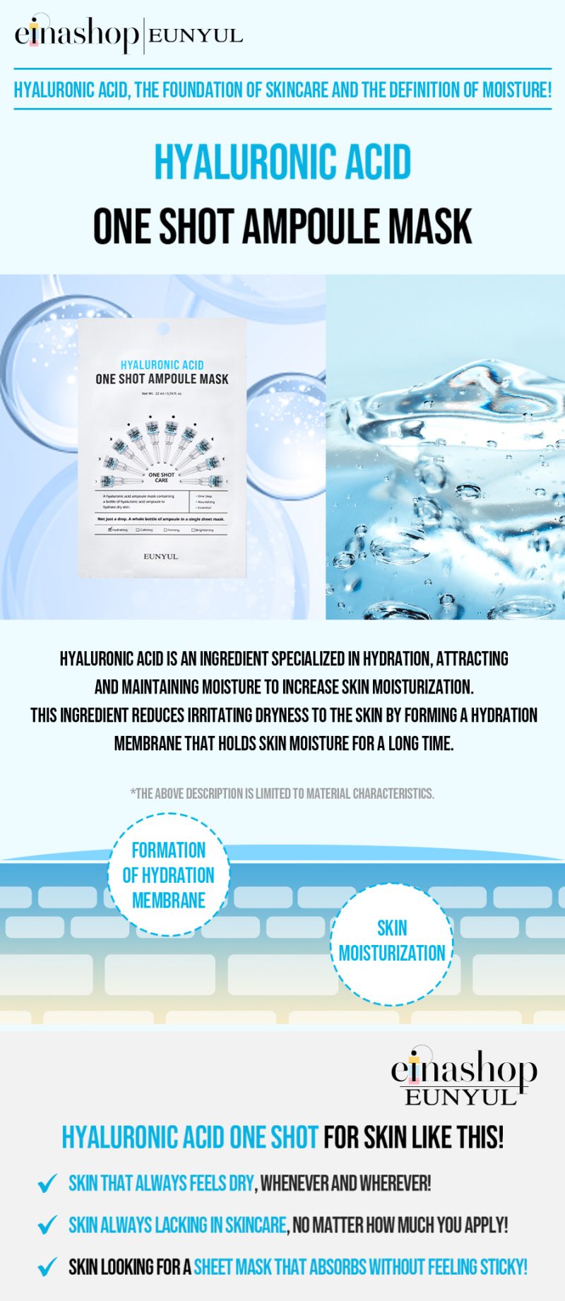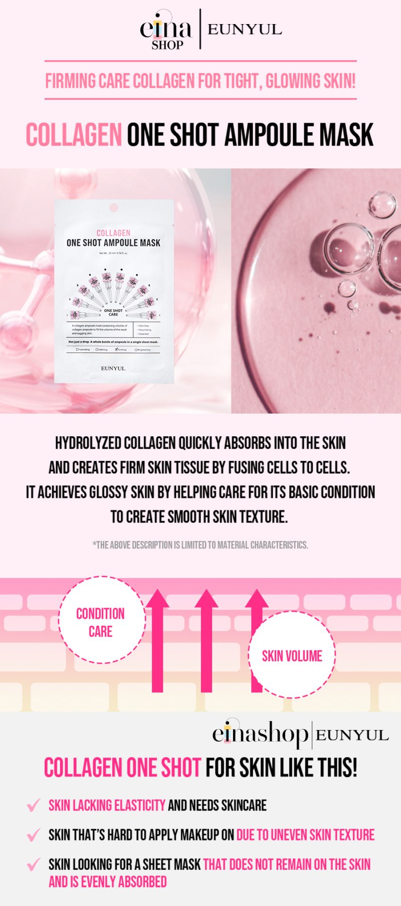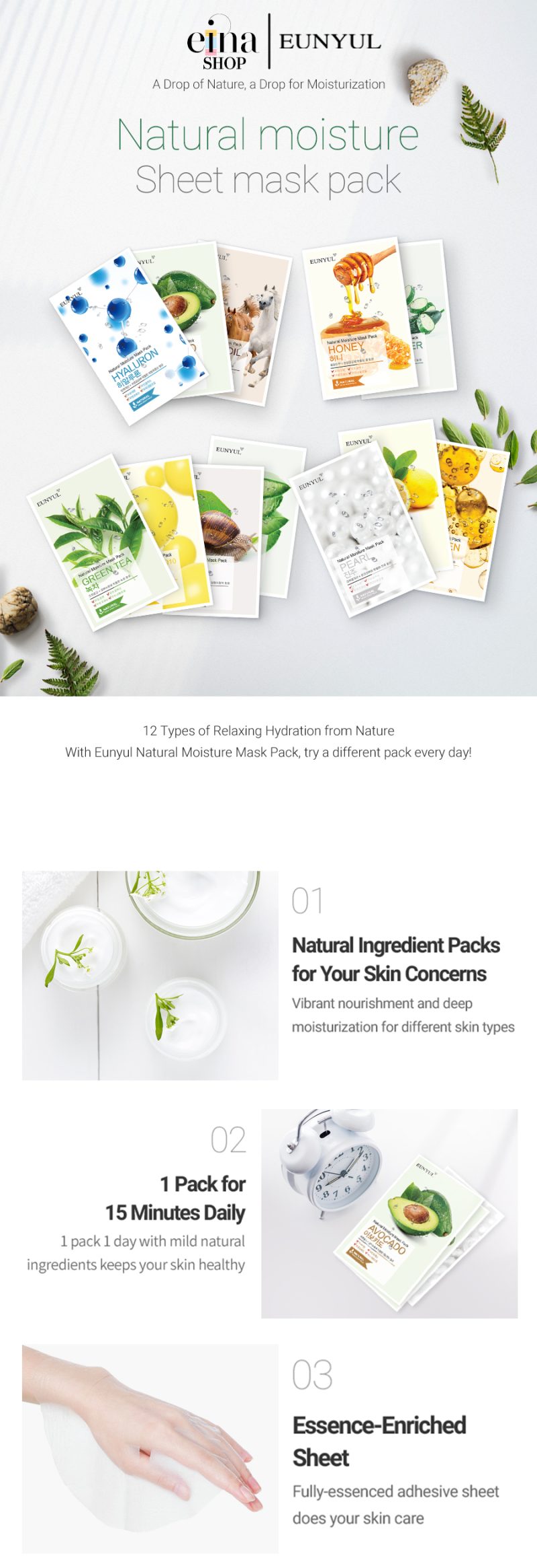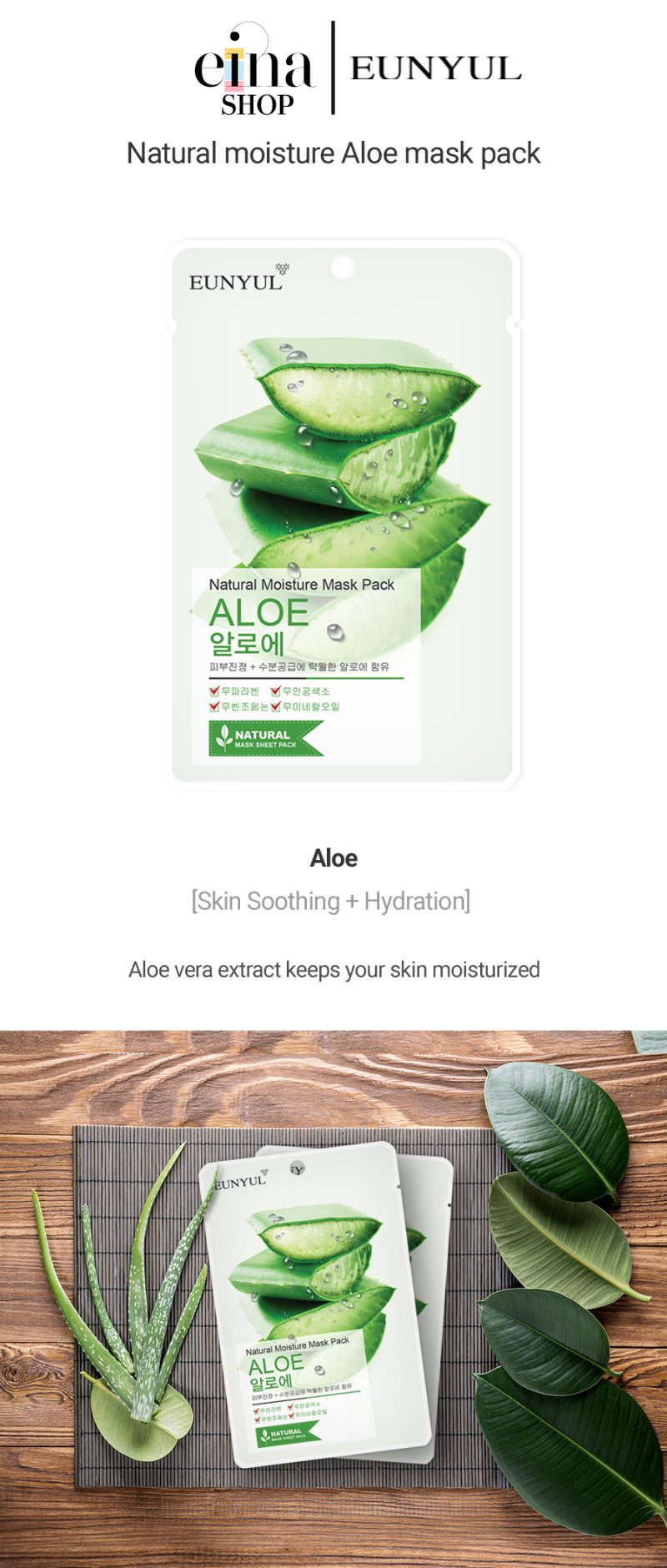 Eunyul Face Mask is available in 4 types. Natural Aloe Vera Sheet Mask, One Shot Collagen Sheet Mask, One Shot Hyaluronic acid Sheet Mask, and Purity Collagen Sheet Mask.