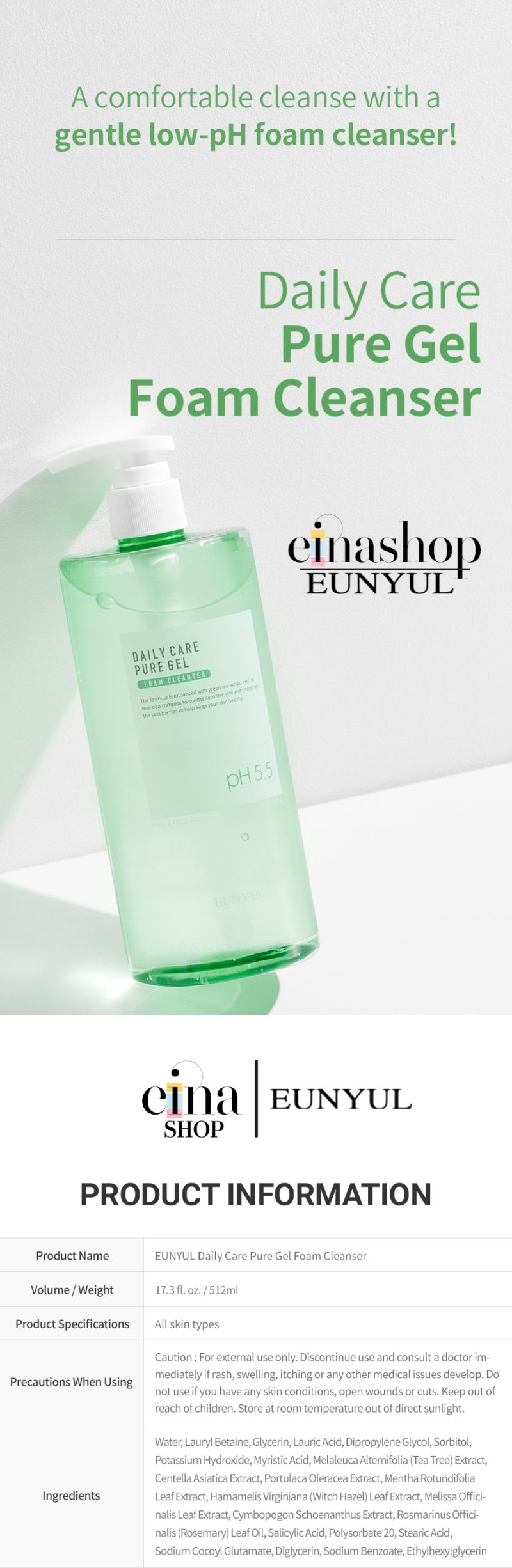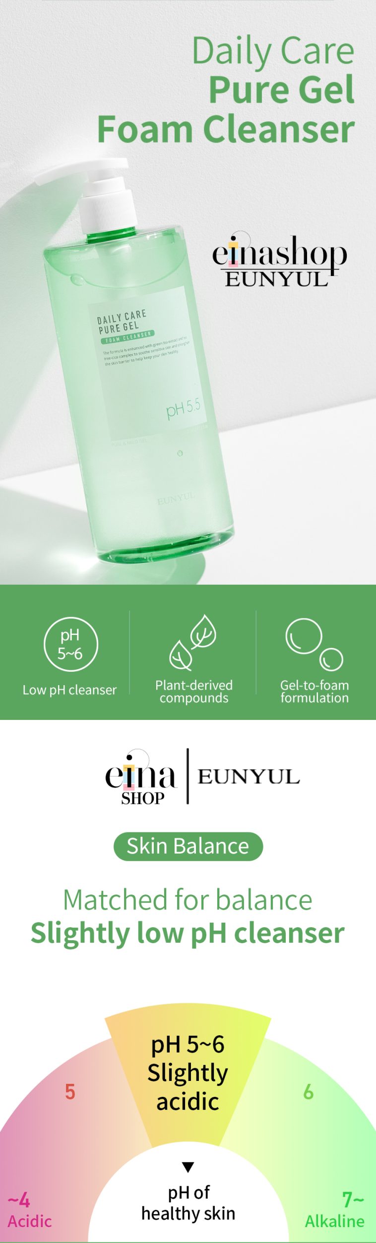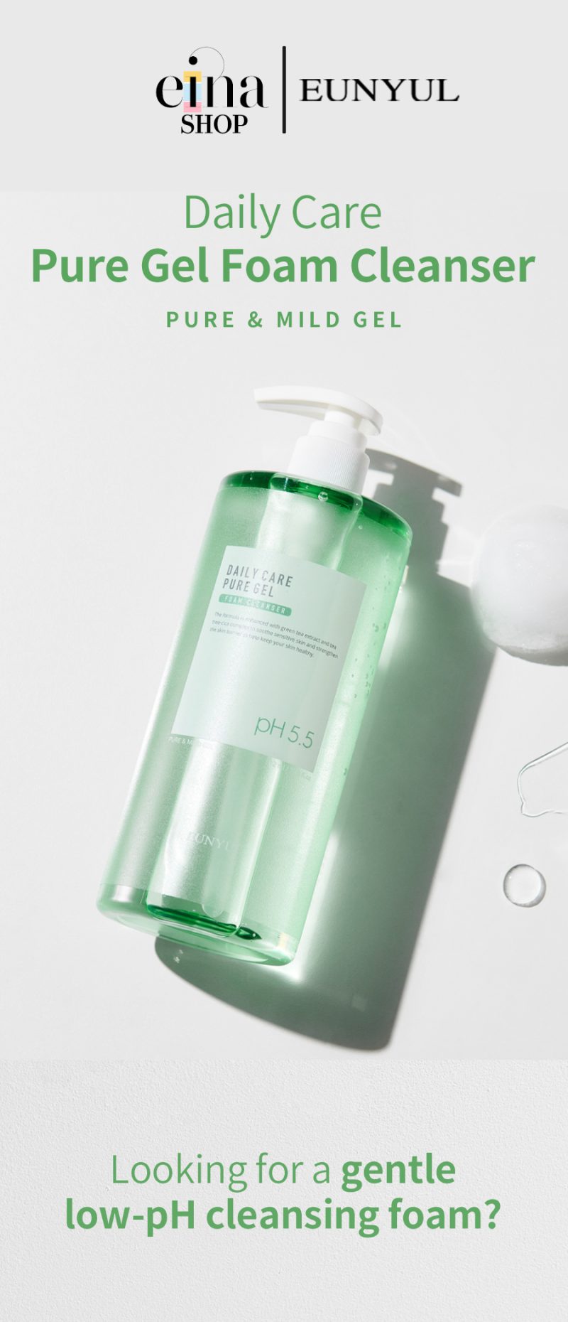 • Eunyul Daily Care Pure Bubble Gel Foam Cleanser is a slightly low-pH cleanser. It matches the slightly acidic pH of the skin to keep the natural balance of the skin.