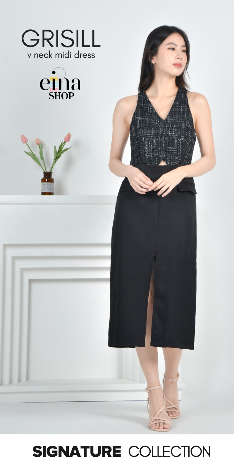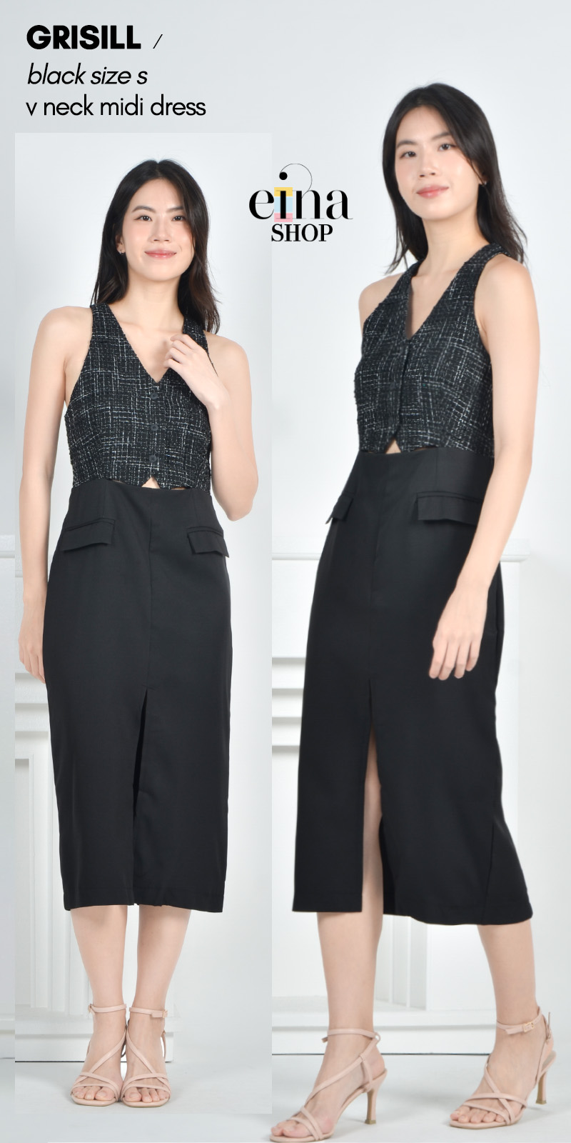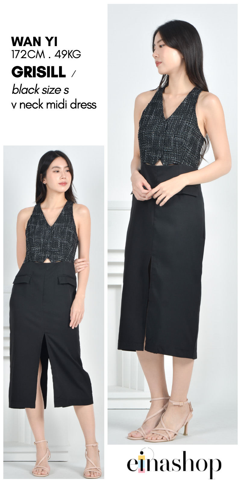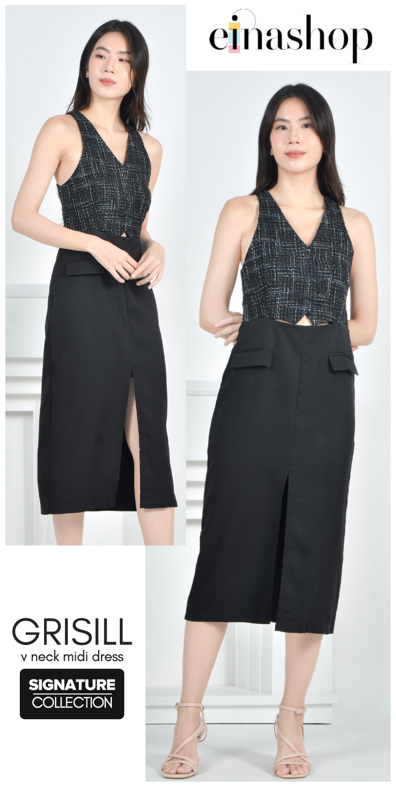 • Grisill dress featuring a v neckline, it draws the eye downward, creating a visual line that makes the neck appear longer and the upper body appear slimmer.