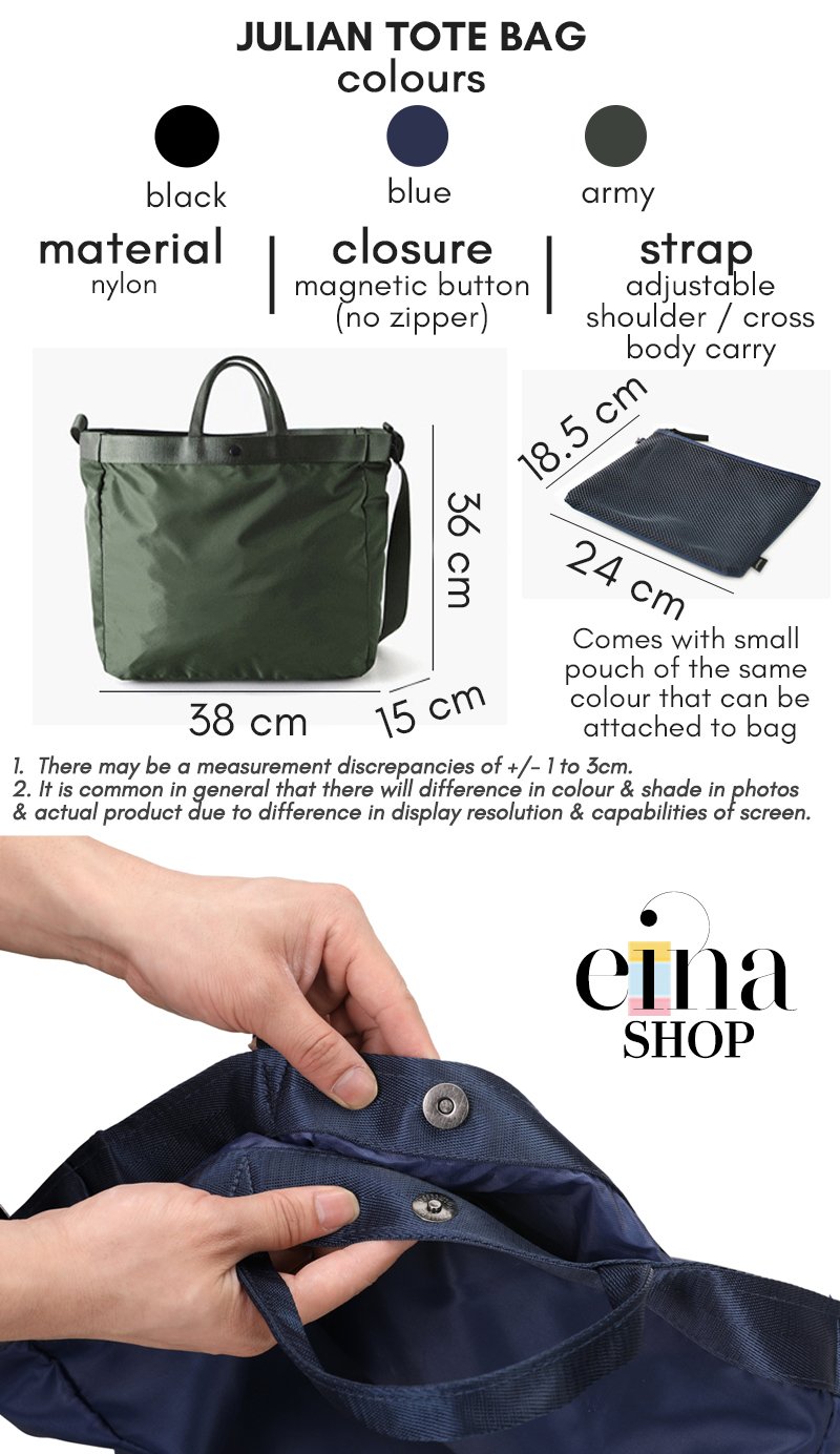 Made with lightweight water-resistant nylon. Comes with a convenient magnetic button closure. The bag comes with a pouch of the same colour that you can use to keep the bag for easy storage or as a zipped pouch to store your smaller items. The pouch can be hooked to the bag with a string attachment.