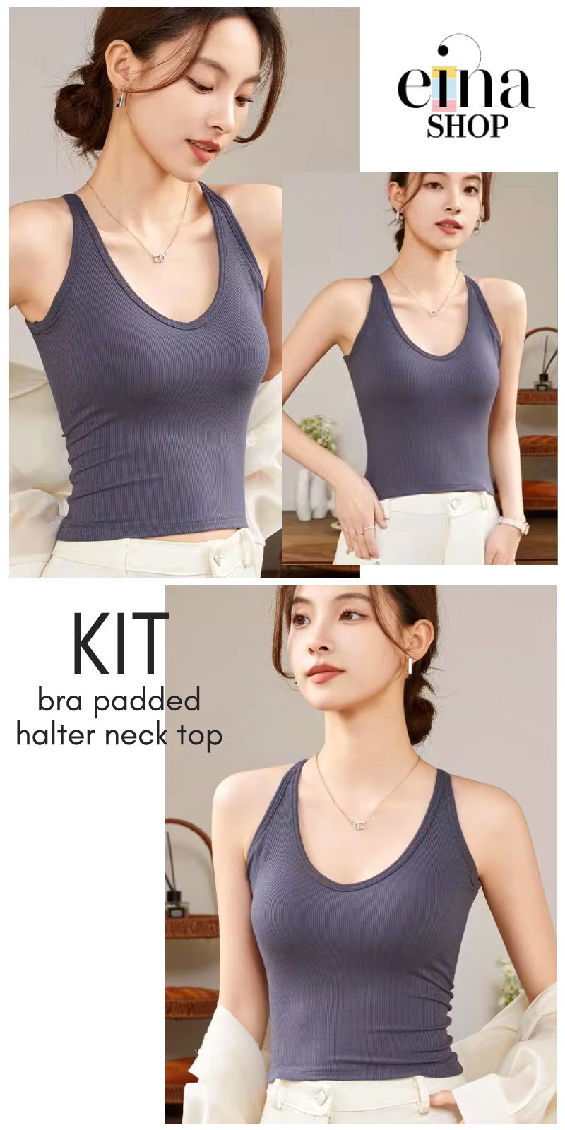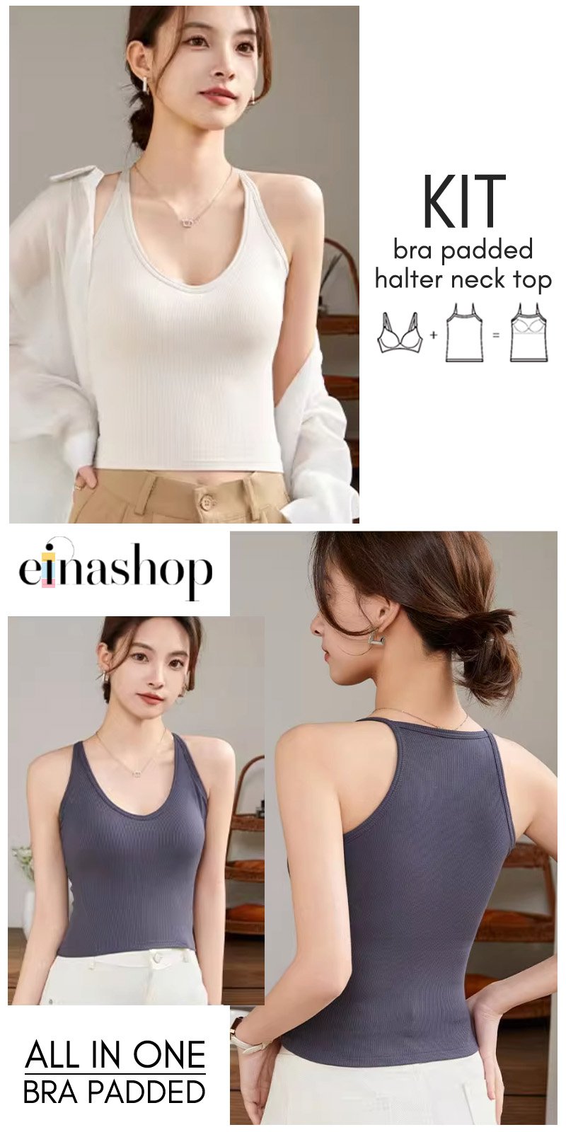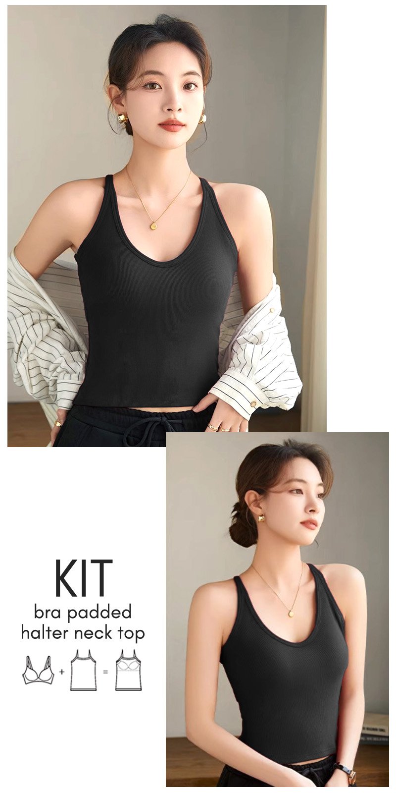 Kit Bra Padded Halter Neck Top highlighting the shoulders and neckline, providing a comfortable and breezy feel, and offering versatile styling options.