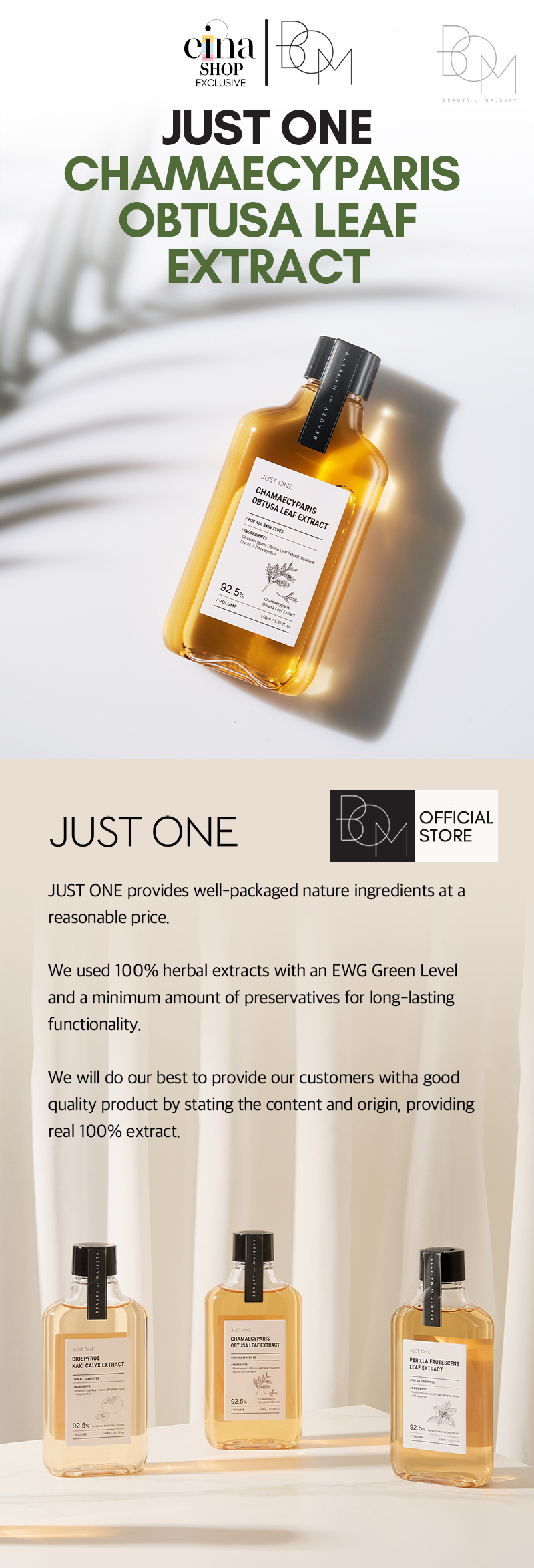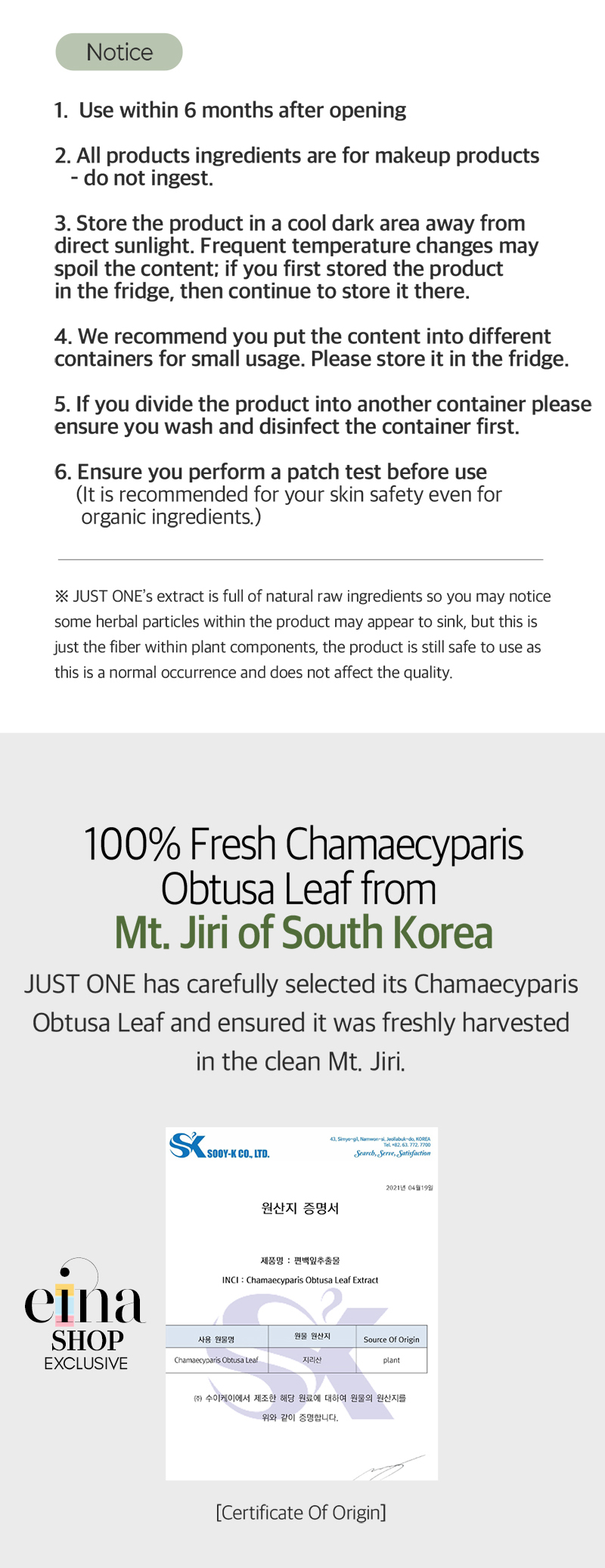 Just One Chamaecyparis Obtusa Leaf Extract – 100% herbal extracts with an EWG Green Level and a minimum amount of preservatives for long-lasting functionality.