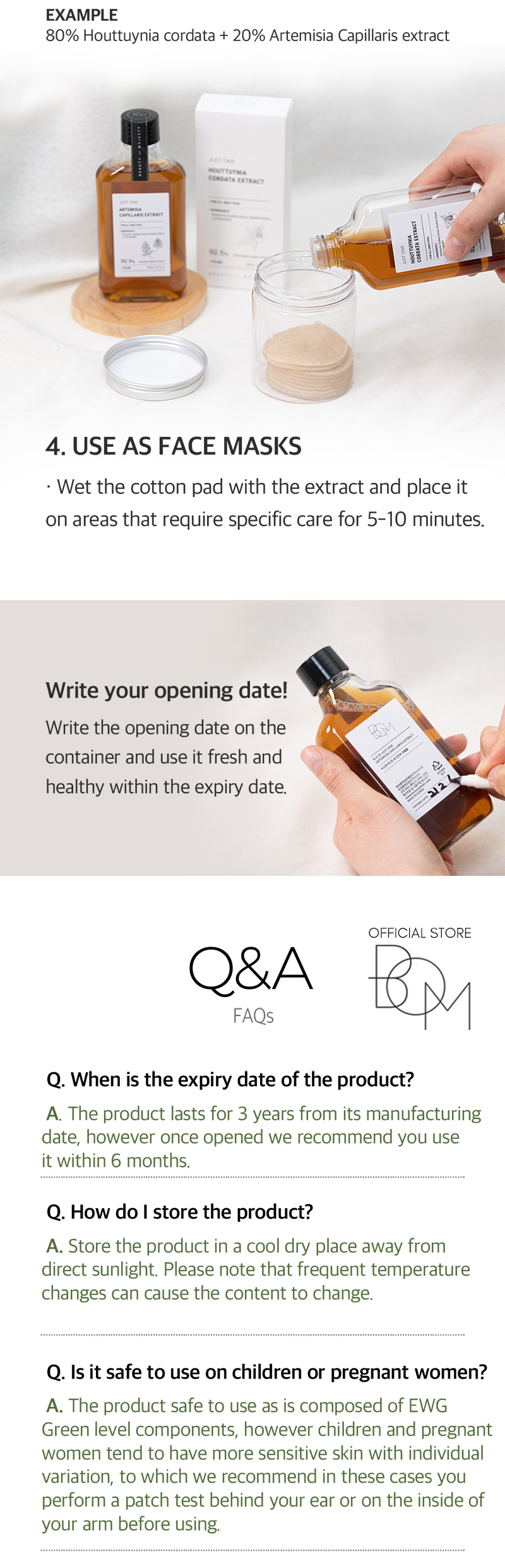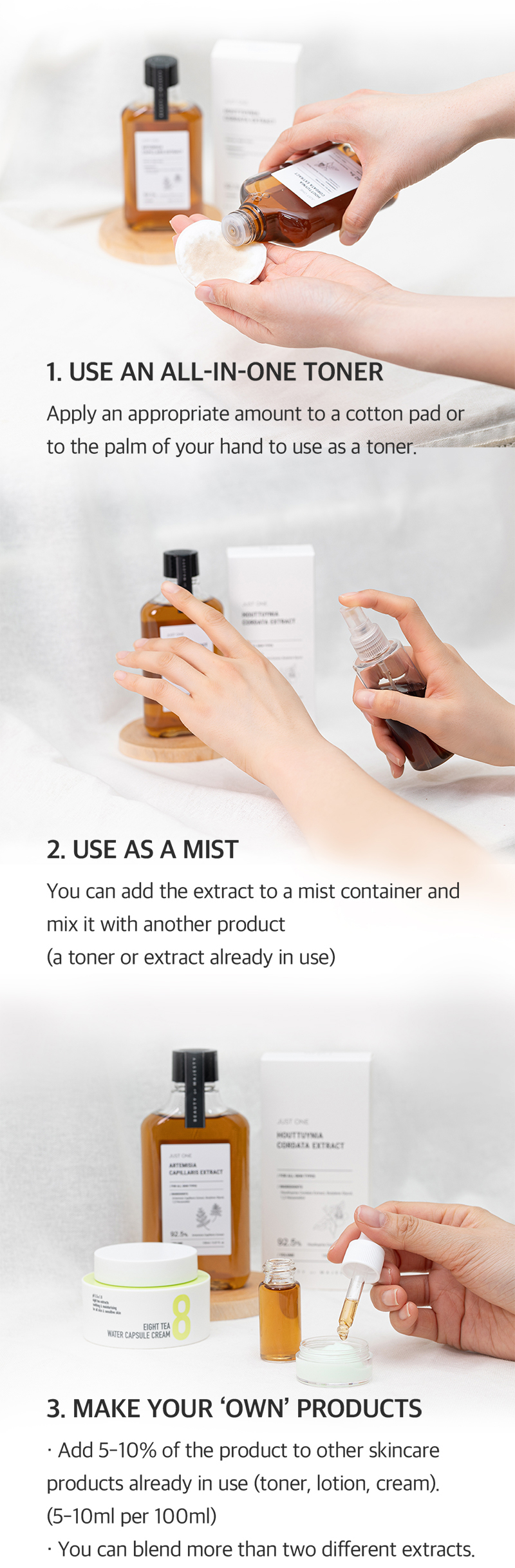 You can use the extract as a toner, as a mist by mixing it with another toner that you are using or you can use it as a face mask by applying it to a cotton pad and placing it on needed areas. You can mix 2 or more extracts together or add them to toner, lotion, or cream you use with a 5-10% ratio in accordance with the texture.