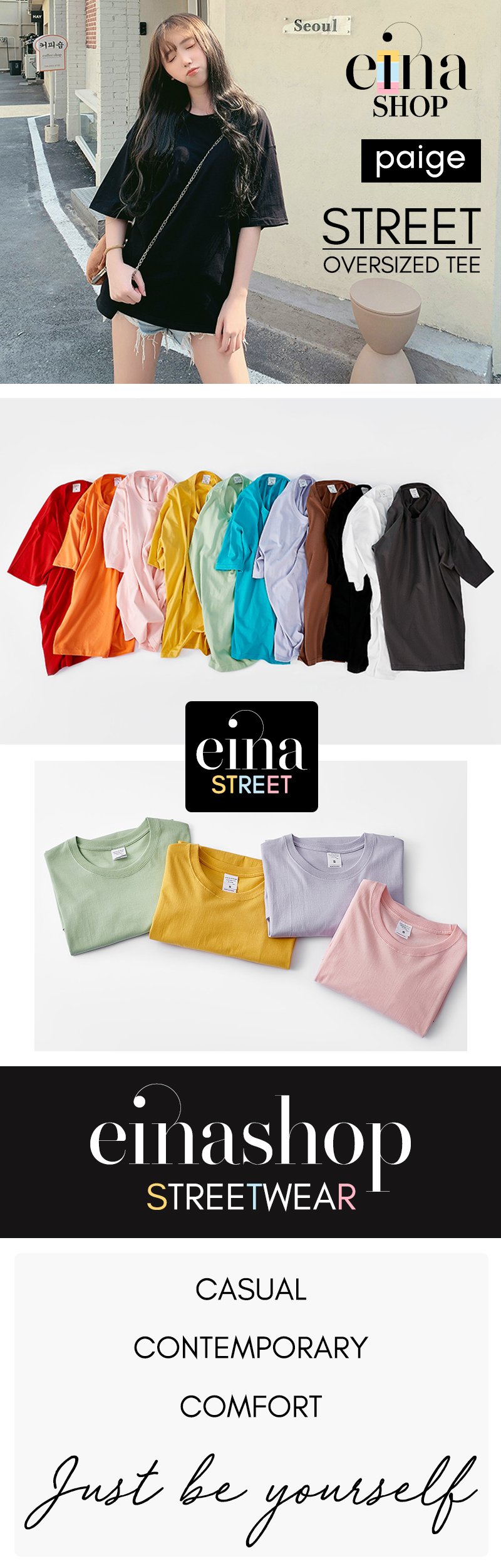 Einashop streetwear collection – Casual, Contemporary, Comfort. Just be yourself. Premium quality basic plain in a trendy oversized cut that is comfortable yet trendy.