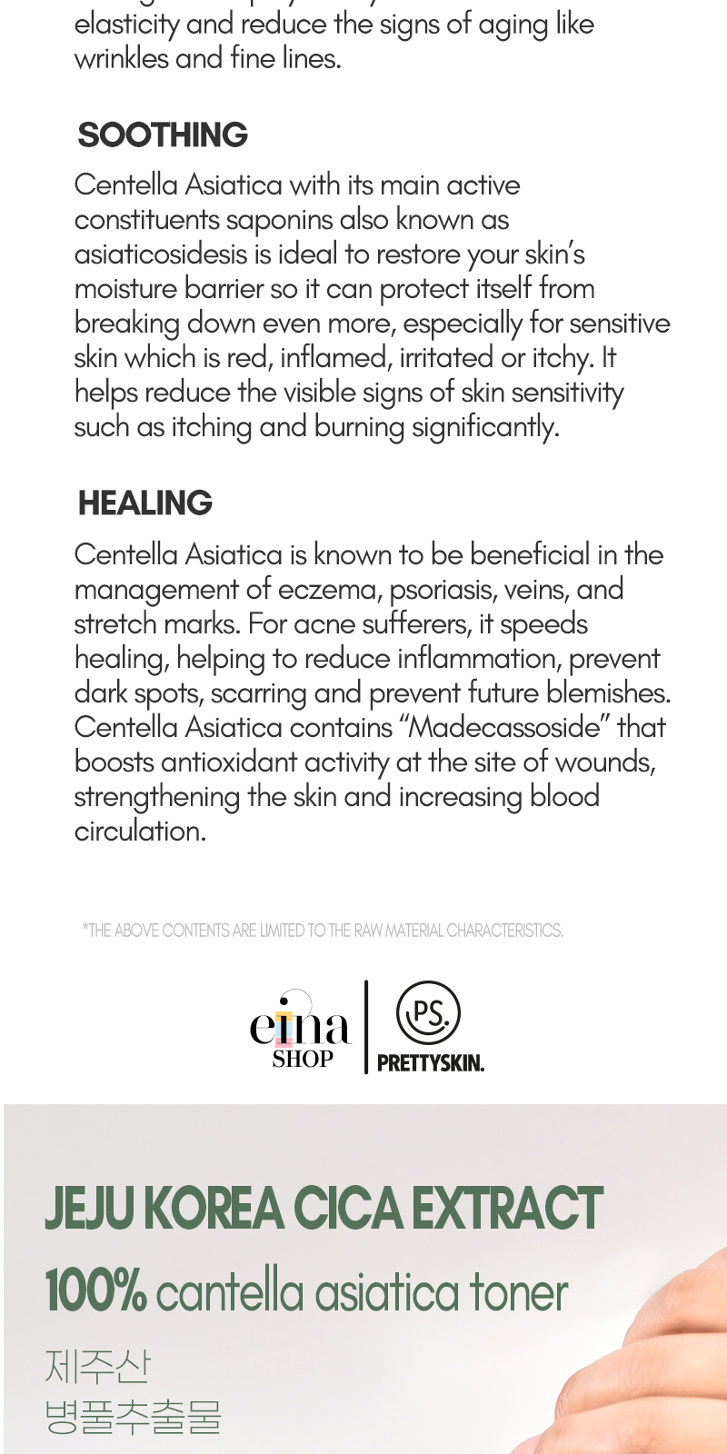 • Centella Asiatica aka cica is safe for all skin types. Featuring moisturizing, astringent and healing qualities, it is ideal for tackling oily skin problems, acne issues and signs of ageing like wrinkles and sagging skin. The active ingredients have the power to also heal sensitive skin, smoothens rough skin texture for a healthy and clear skin.