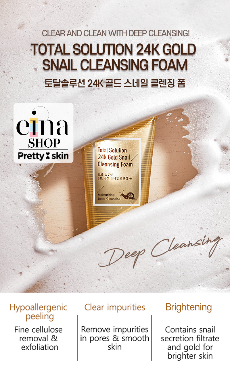 Pretty Skin Total Solution 24K Gold Snail Cleansing Foam removes dirt and impurities deep in the skin to keep skin clean, clear and nourished.