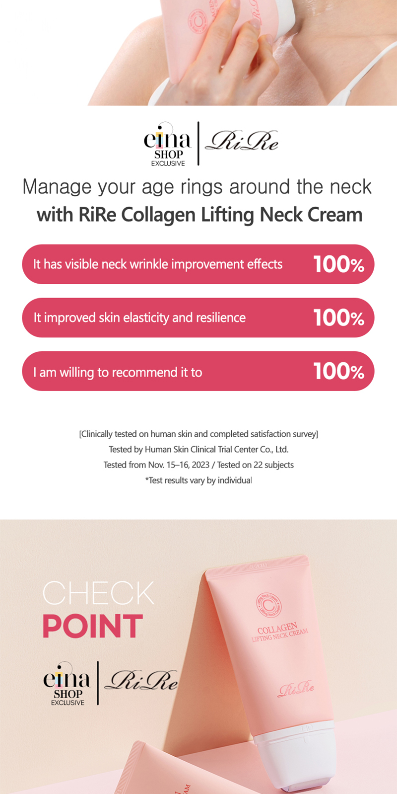 Dermatologically tested and clinically tested on human skin. After 1 time use, improved average depth of folded wrinkles on the neck and skin volume recovery rate after applying pressure.