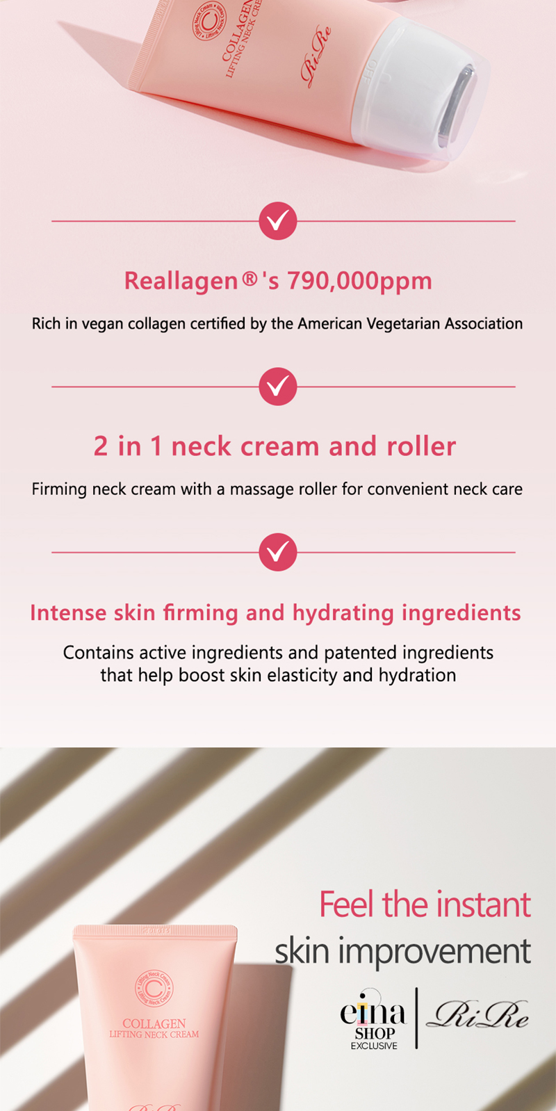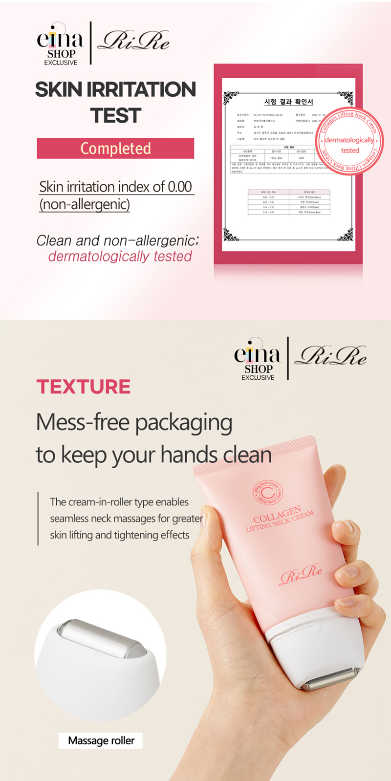 Mess-free packaging to keep your hands clean. The cream-in-roller type enables seamless neck massages for greater skin lifting and tightening effects.