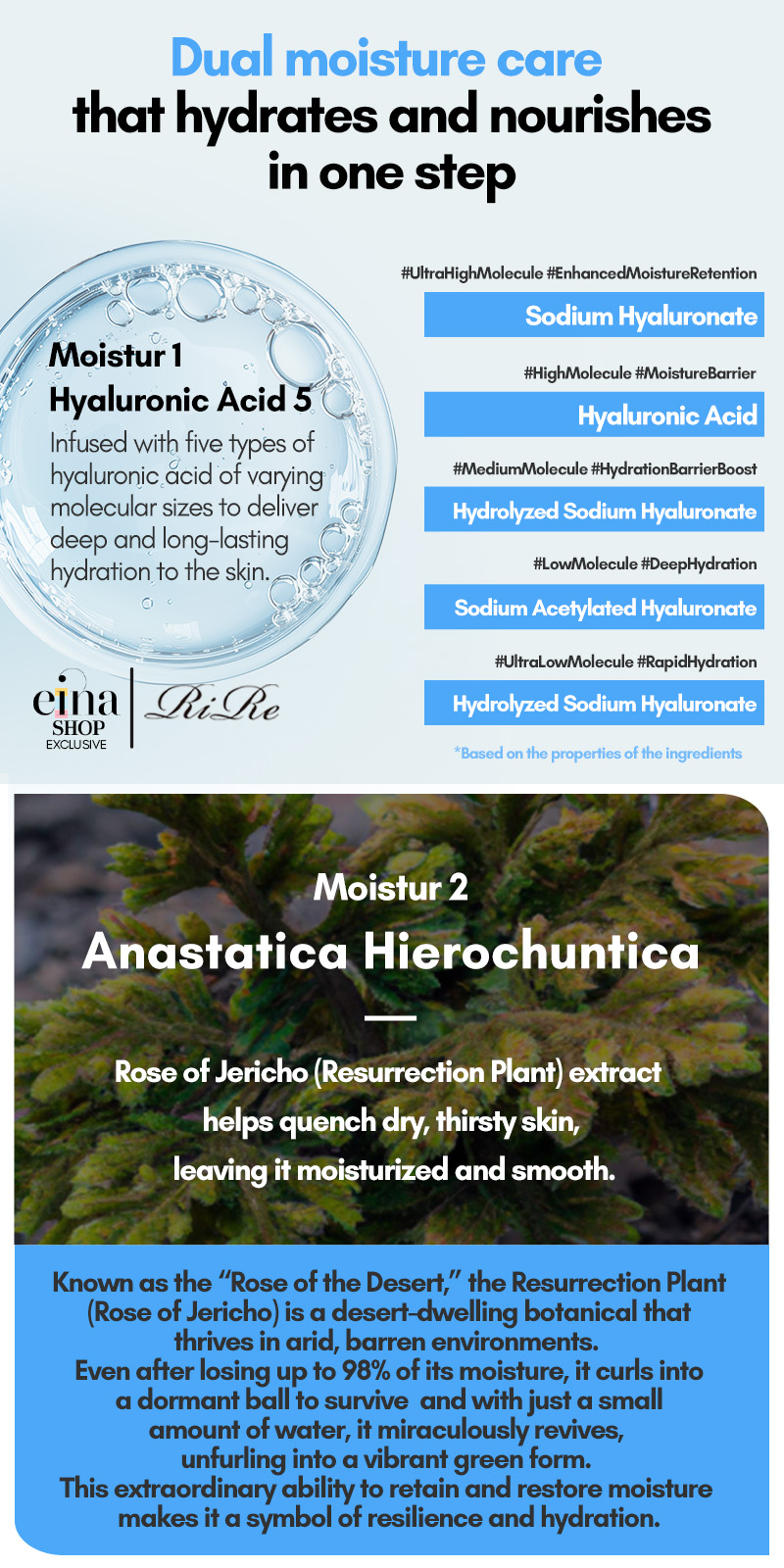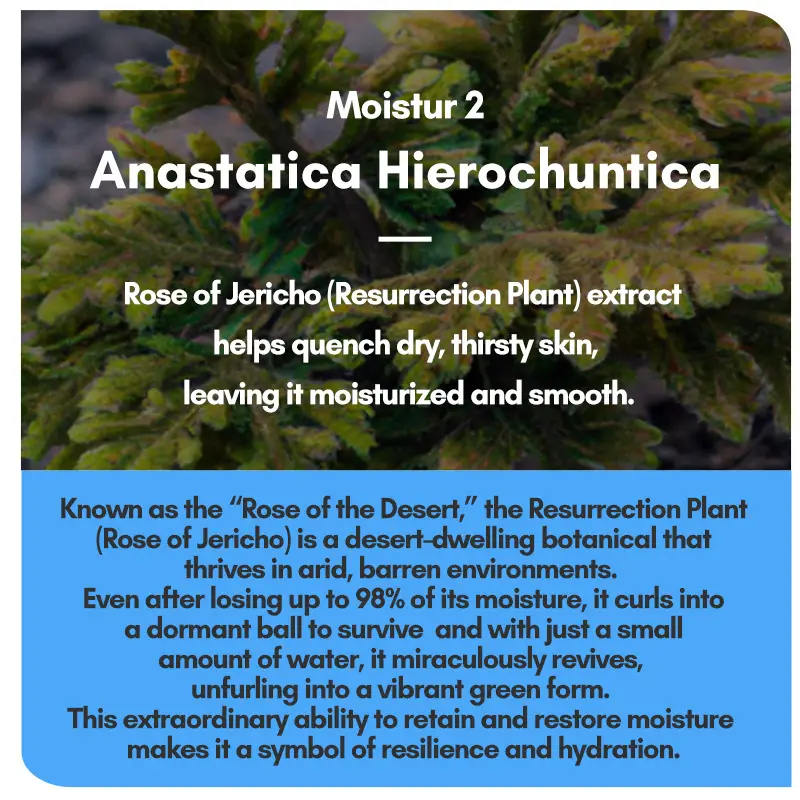 Infused with Sodium Hyaluronate, Hyaluronic Acid, Hydrolyzed Sodium Hyaluronate, Sodium Acetylated Hyaluronate and Hydrolyzed Sodium Hyaluronate to deliver deep and long-lasting hydration to the skin. Rose of Jericho extract helps quench dry, thirsty skin, leaving it moisturized and smooth.