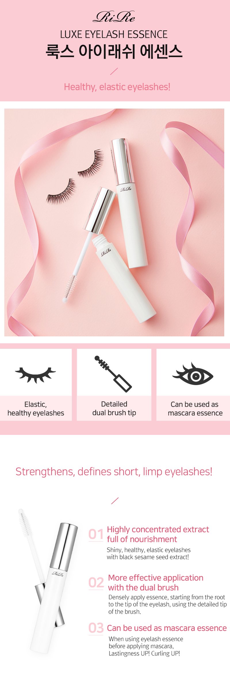Make short and weak eyelashes longer and richer with enriched essence.