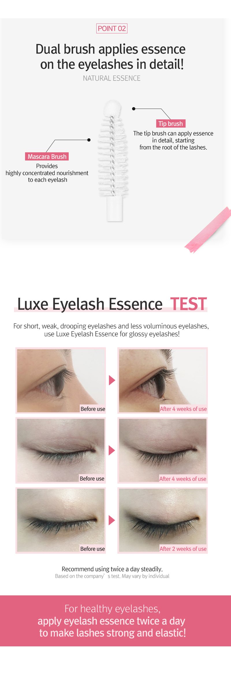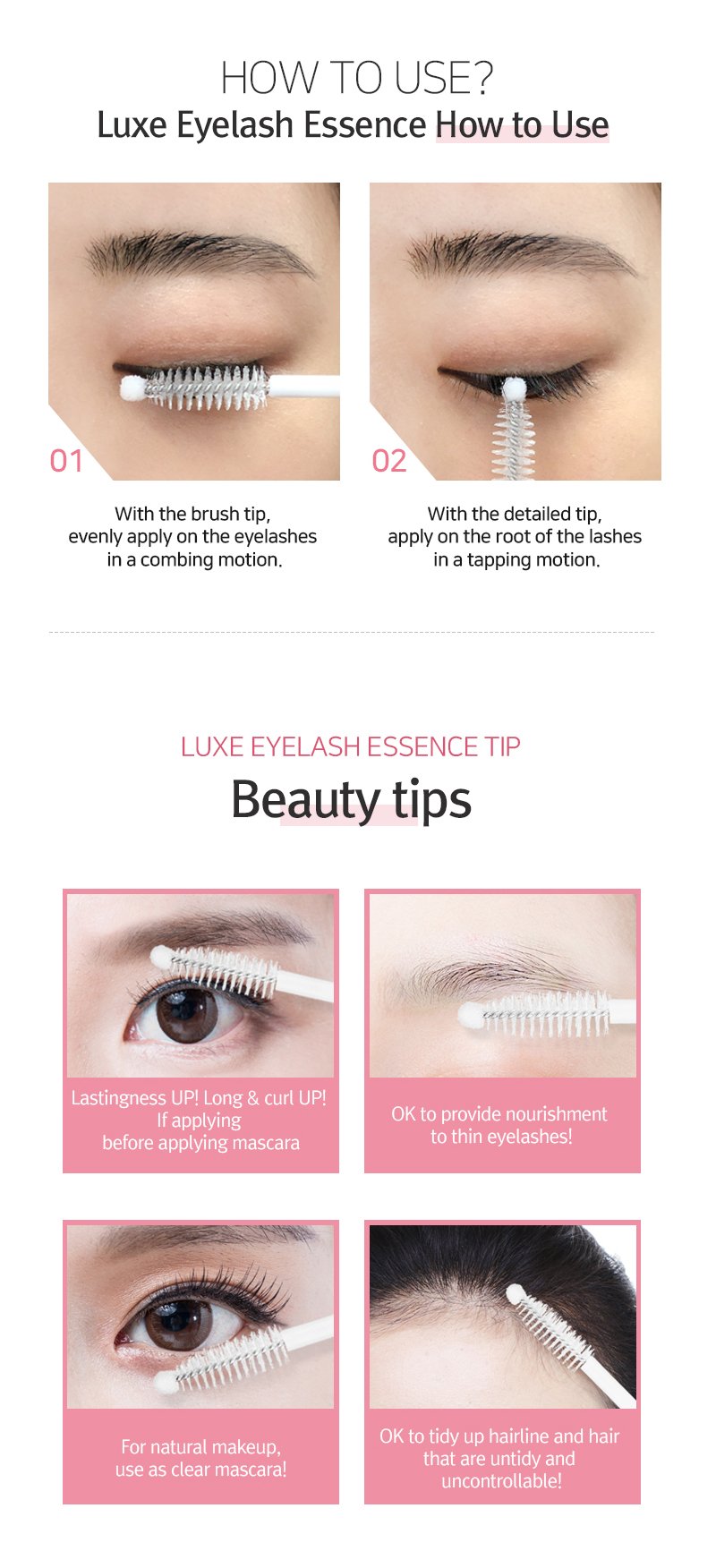 Apply eyelash essence before the use of mascara, it will help with the durability and also have a longer lash effect.