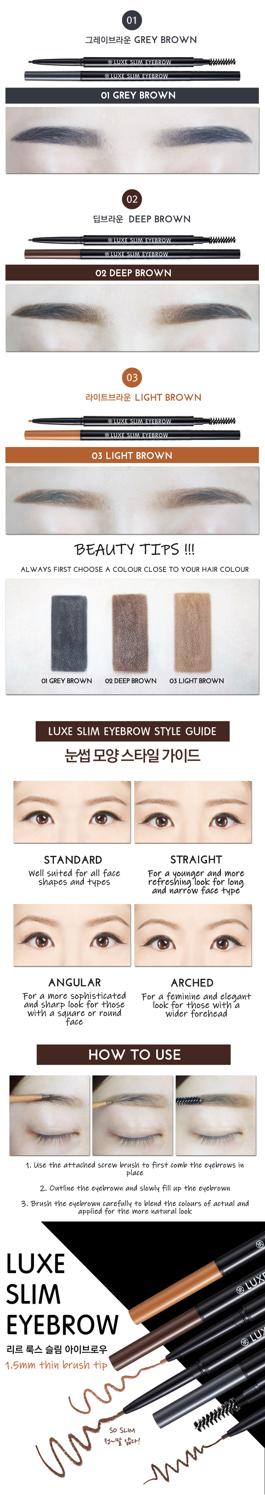 • RiRe latest cosmetic line includes Luxe Slim Eyebrow with 1.5mm of thin brush. It comes with three colors and is perfect for people who wanting to have delicate and natural eyebrows.HOW TO USE