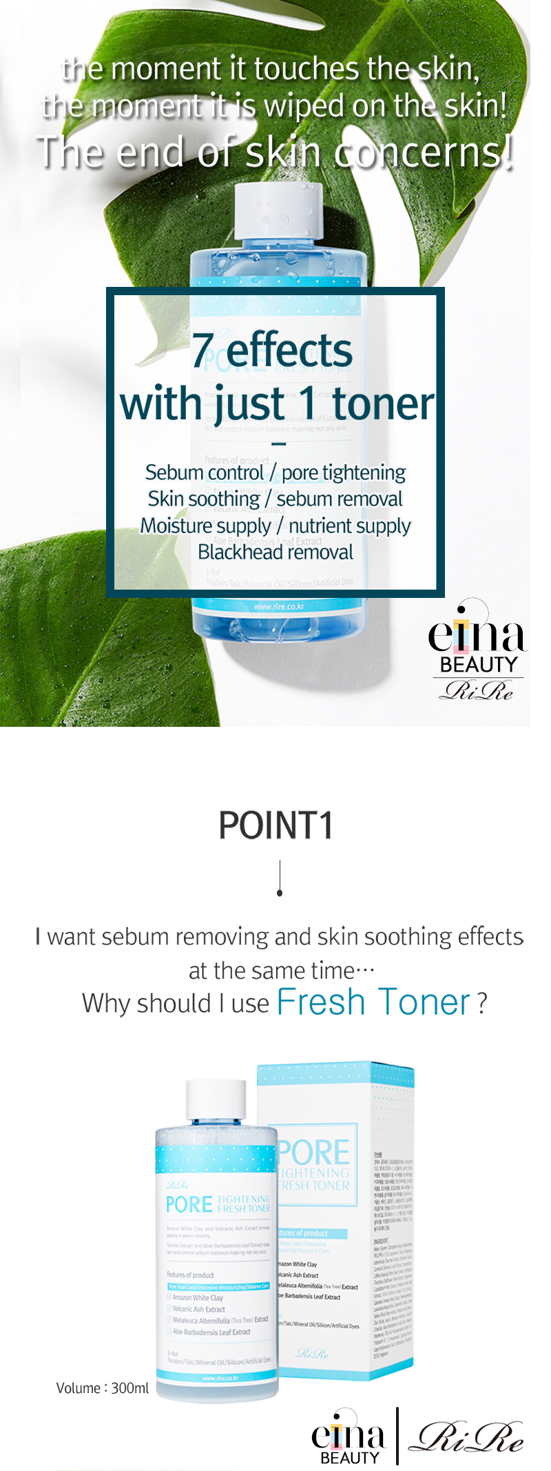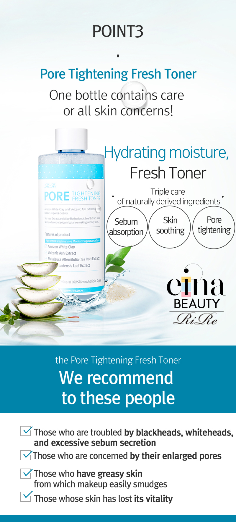 Skin soothing, pore tightening – It soothes the irritated skin with Melaleuca Alternifolia (tea tree) Extract and tidies up the residue in the pores and dust on the skin to help tighten the pores.