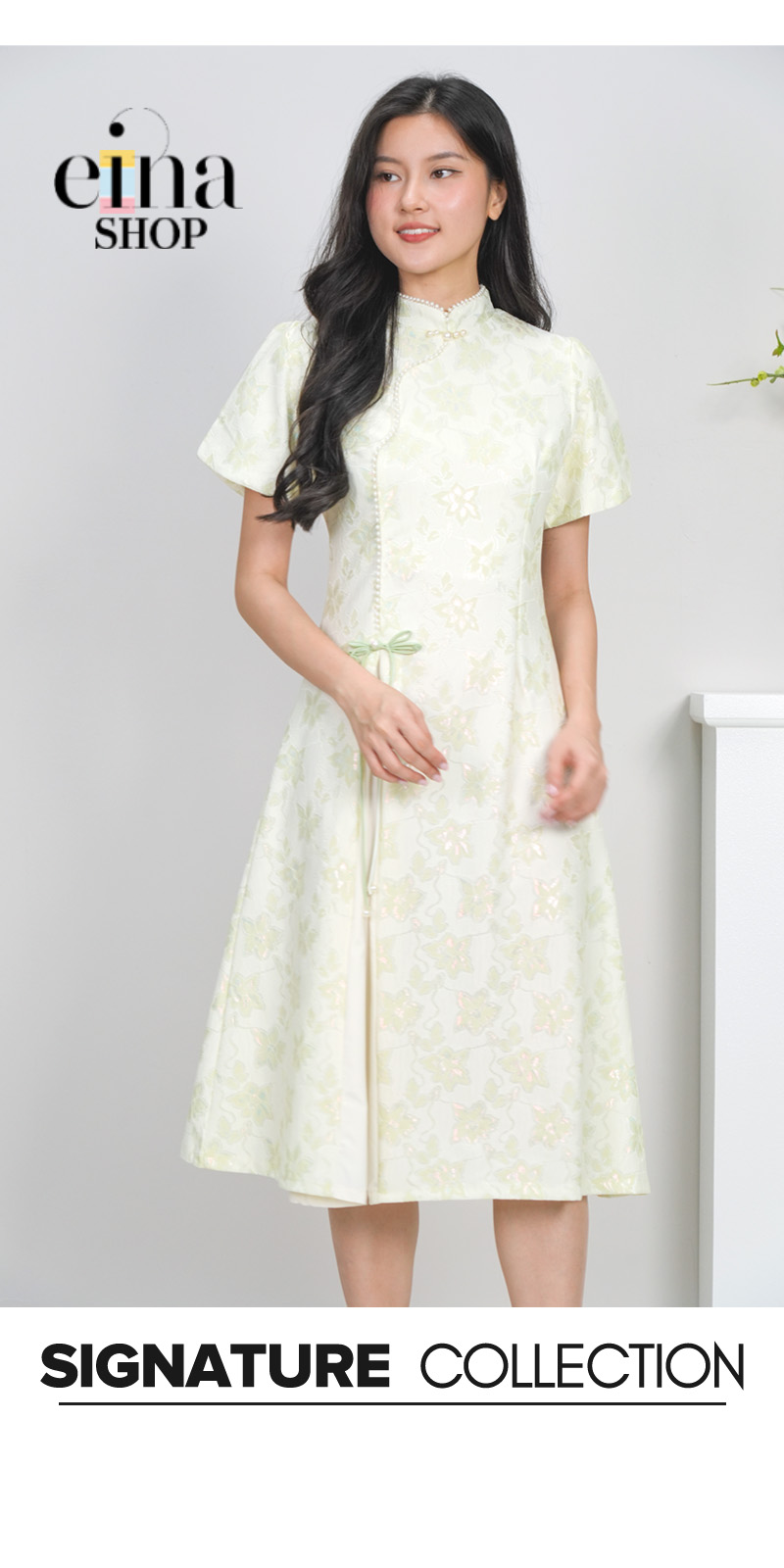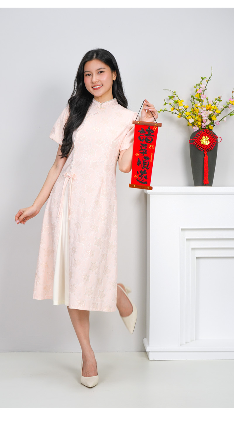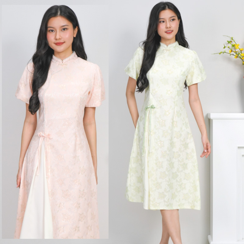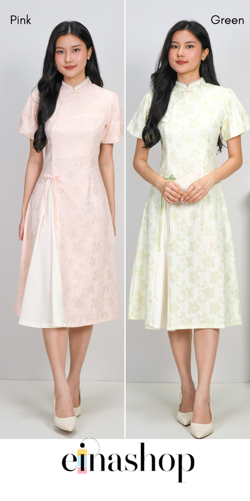 Crafted in a delicate, light green and pink hue with a subtle, all-over floral jacquard pattern, this dress offers a fresh and sophisticated look. The design features a classic mandarin collar, traditional Chinese knotted pankou buttons, and stylish puff short sleeves for a chic silhouette. The A-line cut ensures a comfortable and flattering fit for various body types, providing ease of movement without sacrificing style.