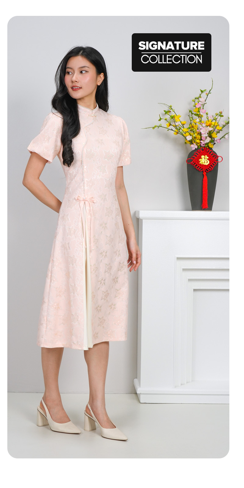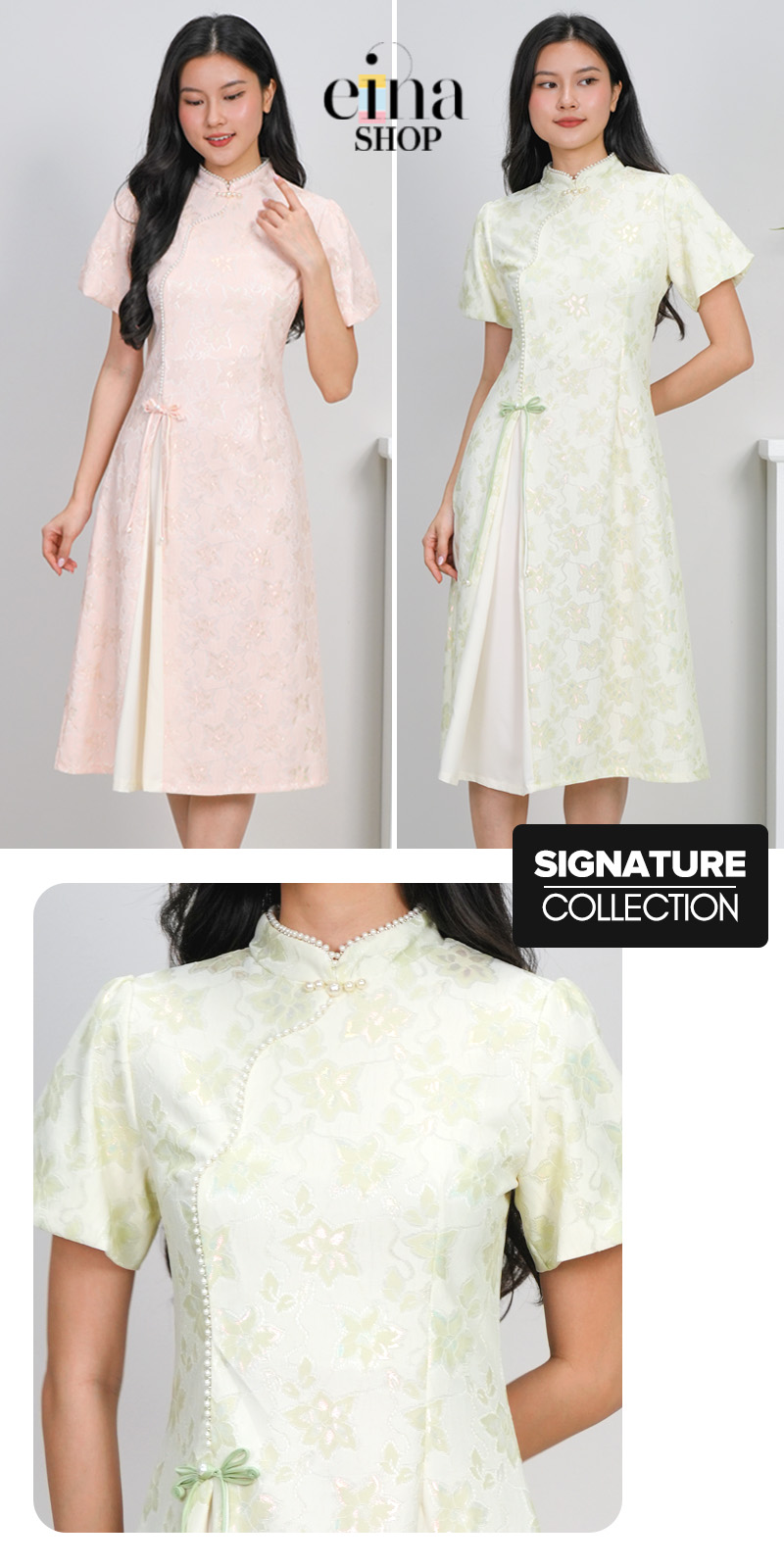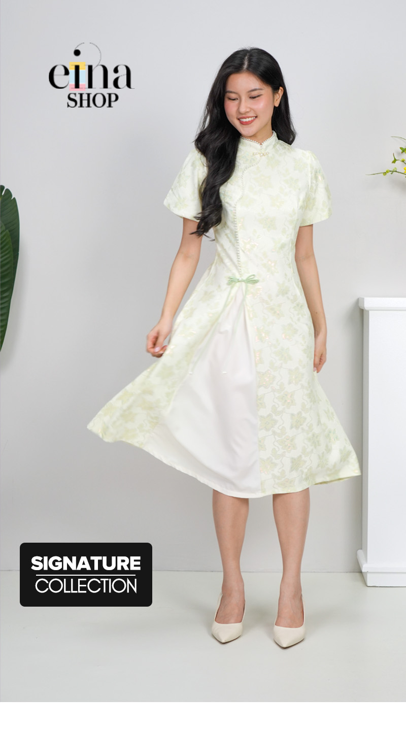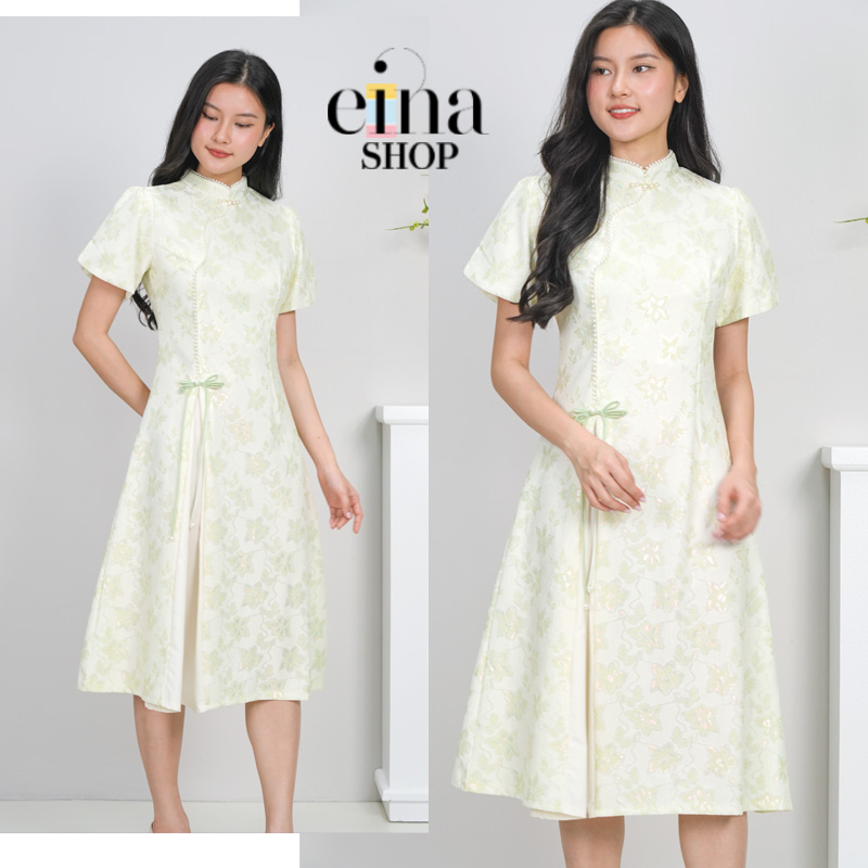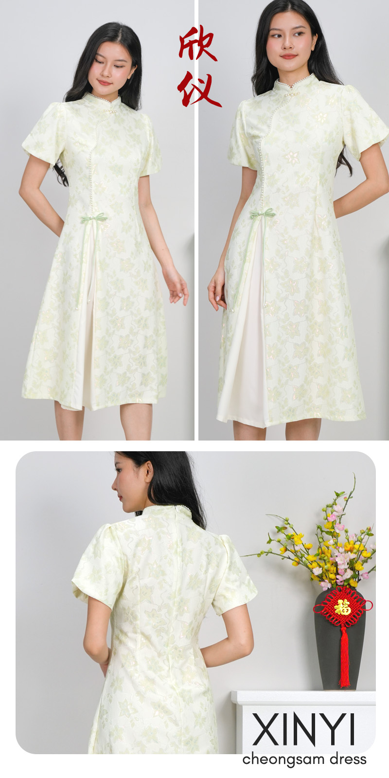 Crafted in a delicate, light green and pink hue with a subtle, all-over floral jacquard pattern, this dress offers a fresh and sophisticated look. The design features a classic mandarin collar, traditional Chinese knotted pankou buttons, and stylish puff short sleeves for a chic silhouette. The A-line cut ensures a comfortable and flattering fit for various body types, providing ease of movement without sacrificing style.