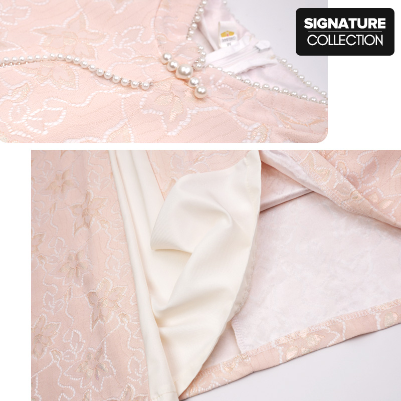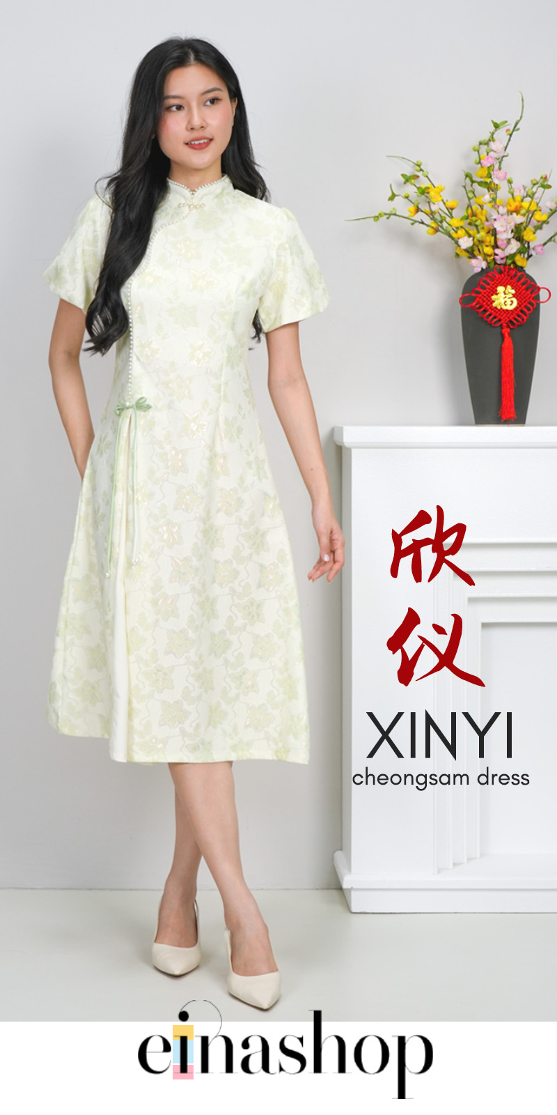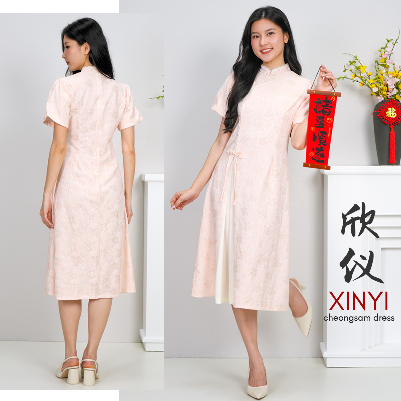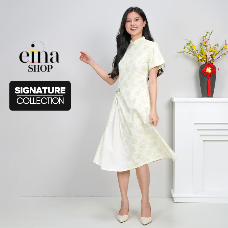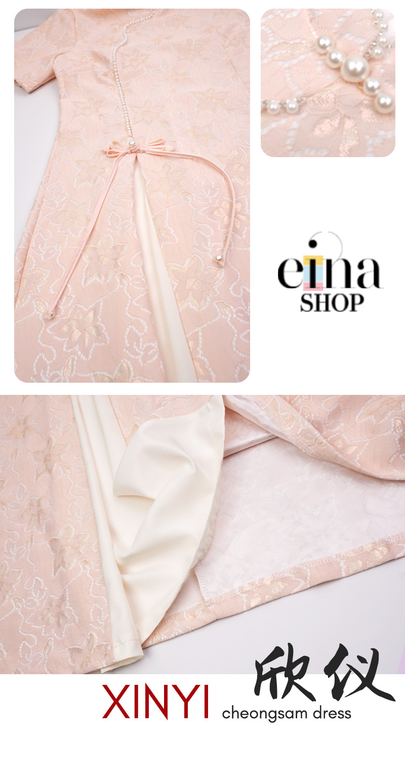 Crafted in a delicate, light green and pink hue with a subtle, all-over floral jacquard pattern, this dress offers a fresh and sophisticated look. The design features a classic mandarin collar, traditional Chinese knotted pankou buttons, and stylish puff short sleeves for a chic silhouette. The A-line cut ensures a comfortable and flattering fit for various body types, providing ease of movement without sacrificing style.
